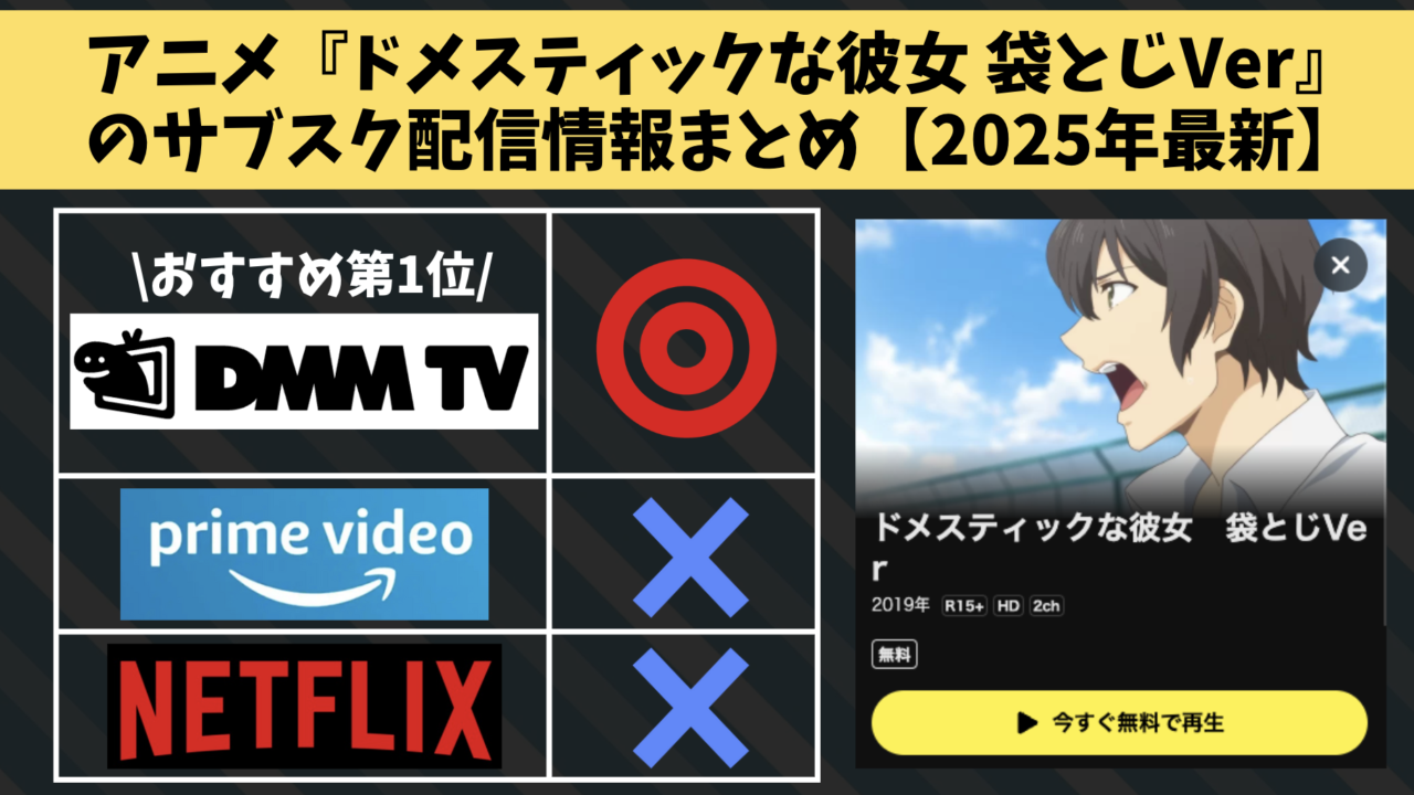 結論としまして、2025年現在でアニメ『ドメスティックな彼女 袋とじVer』を無料視聴できるサブスクは、「DMM TV」「dアニメストア」となります。