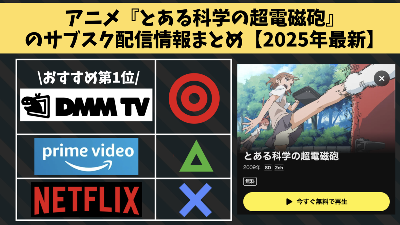 結論としまして、2025年現在でアニメ『とある科学の超電磁砲』を無料視聴できるサブスクは、「DMM TV」「U-NEXT」「dアニメストア」となります。