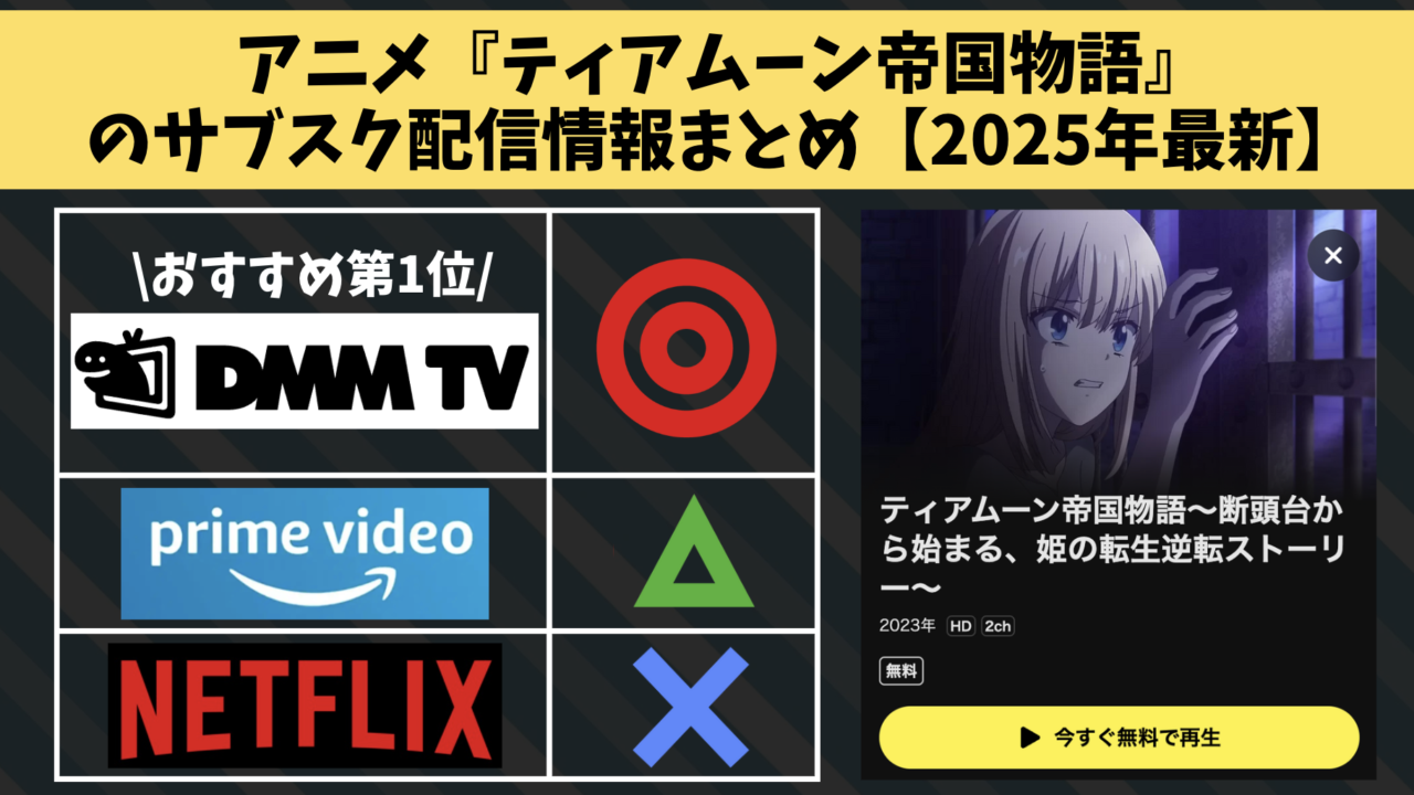 本記事では、アニメ『ティアムーン帝国物語〜断頭台から始まる、姫の転生逆転ストーリー〜』の配信状況について解説しています。