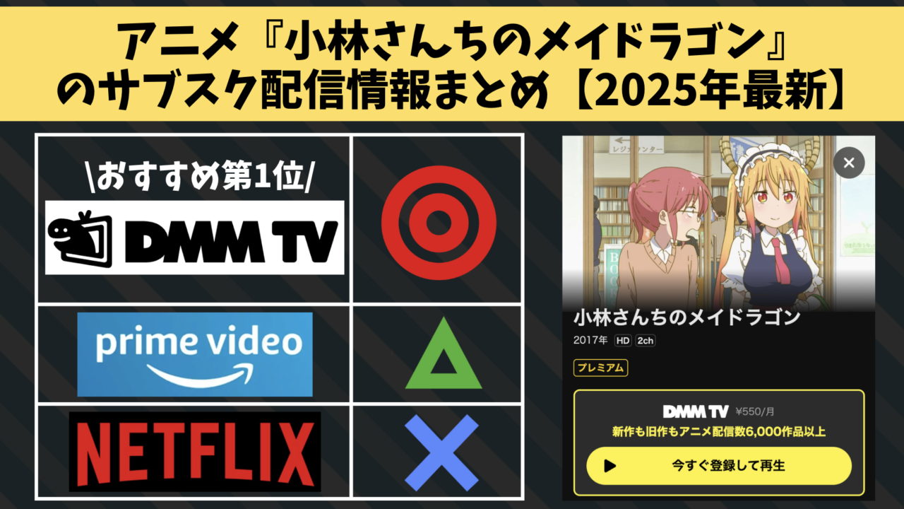 調査の結果、2025年現在でアニメ『小林さんちのメイドラゴン』を無料視聴できるサブスクは、「DMM TV」「U-NEXT」「dアニメストア」となります。