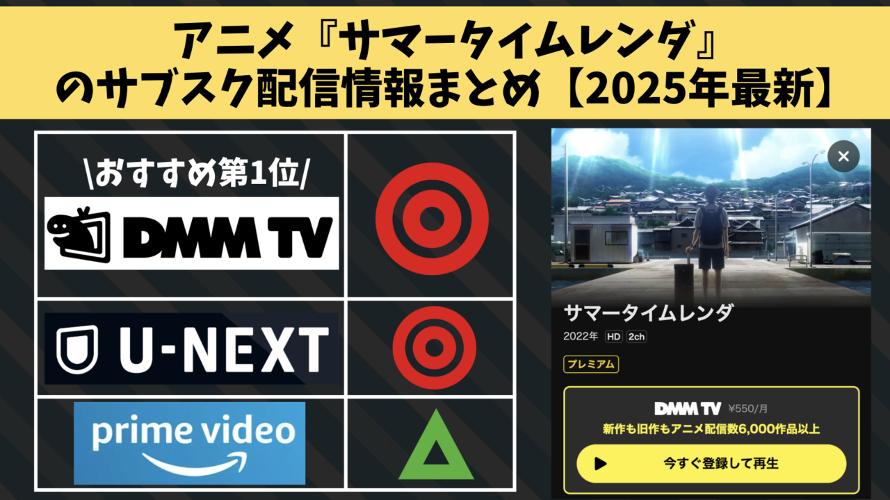 アニメ『サマータイムレンダ』の大手サブスクサービスでの配信状況を調査し、「どこで見れるのか」一覧にまとめました。