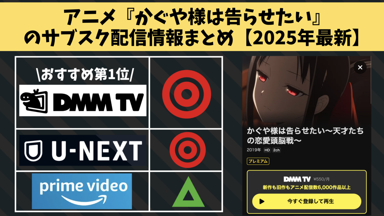 アニメ『かぐや様は告らせたい』の大手サブスクサービスでの配信状況を調査し、「どこで見れるのか」一覧にまとめました。