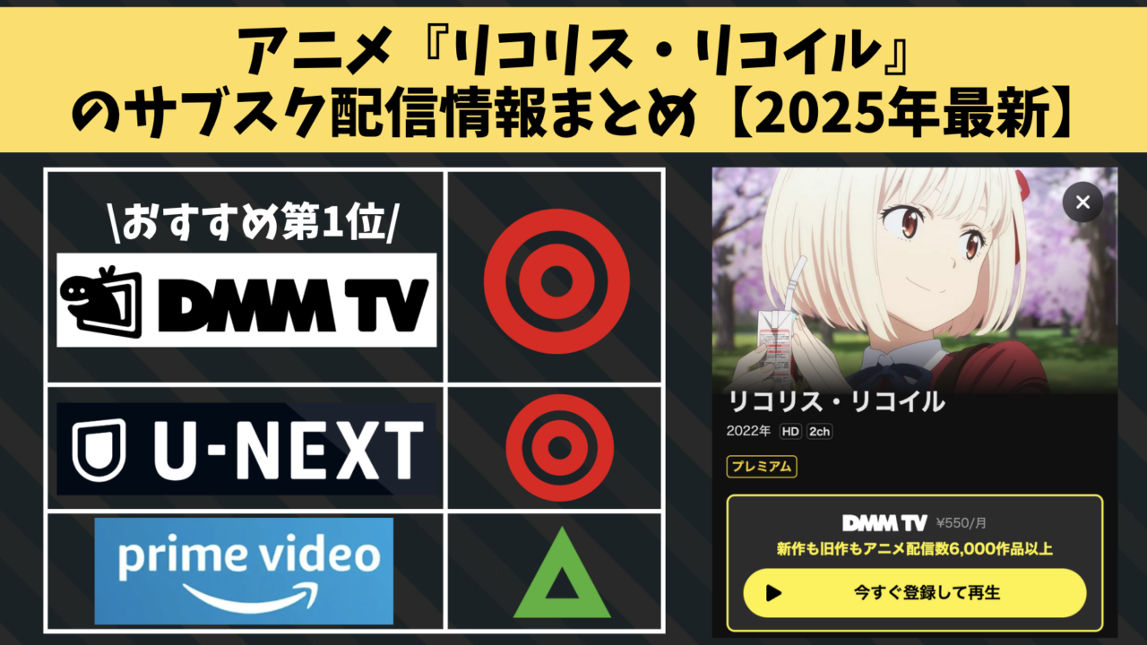 アニメ『リコリス・リコイル』の大手サブスクサービスでの配信状況を調査し、「どこで見れるのか」一覧にまとめました。