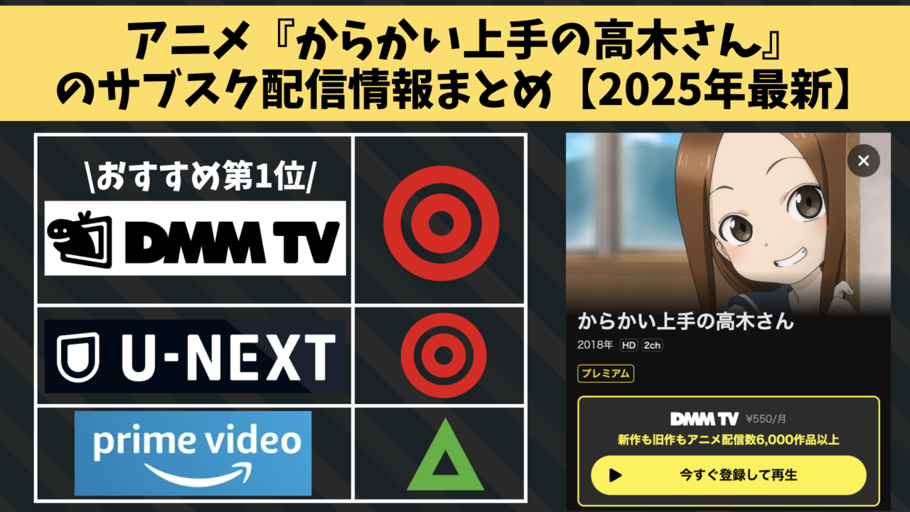 アニメ『からかい上手の高木さん』の大手サブスクサービスでの配信状況を調査し、「どこで見れるのか」一覧にまとめました。
