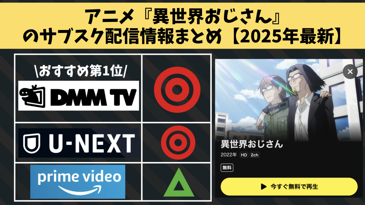 結論としまして、2025年現在でアニメ『異世界おじさん』を無料視聴できるサブスクは、「DMM TV」「U-NEXT」「dアニメストア」「Netflix」となります。