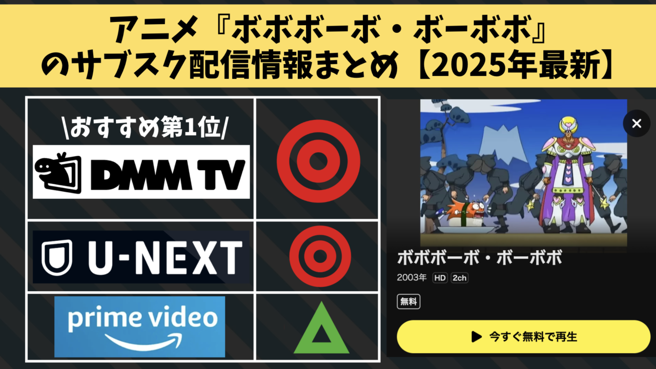 アニメ『ボボボーボ・ボーボボ』の大手サブスクサービスでの配信状況を調査し、「どこで見れるのか」一覧にまとめました。