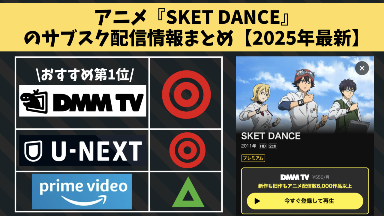 アニメ『SKET DANCE』の大手サブスクサービスでの配信状況を調査し、「どこで見れるのか」一覧にまとめました。
