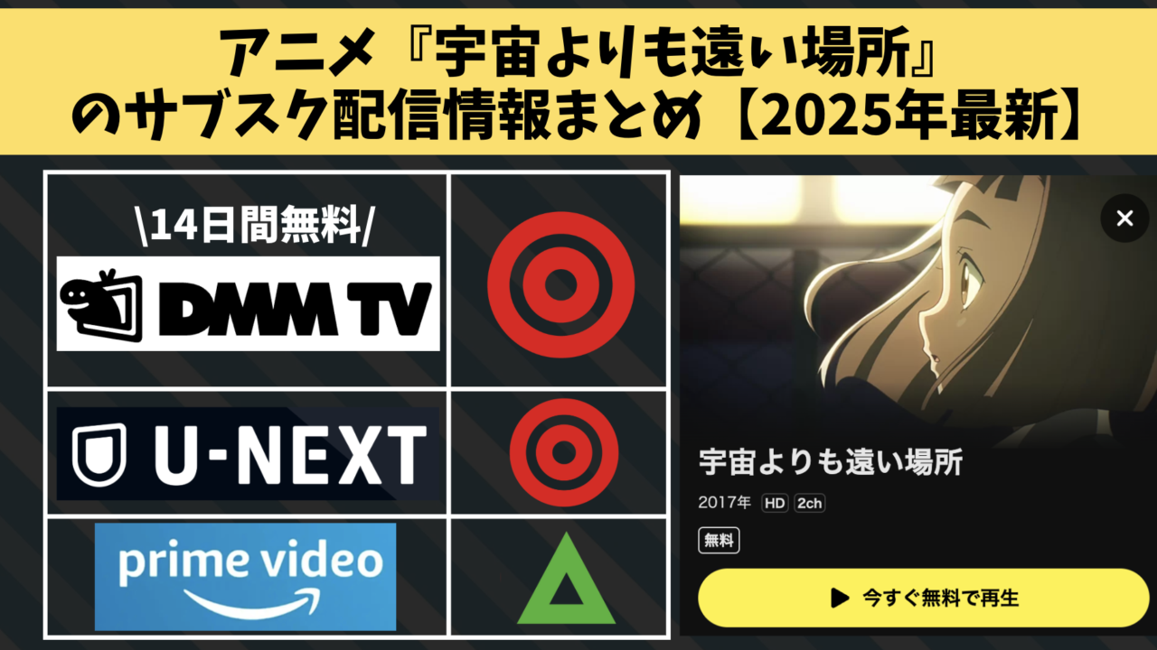 結論としまして、2025年現在でアニメ『宇宙よりも遠い場所』を無料視聴できるサブスクは、「DMM TV」「U-NEXT」「dアニメストア」「Netflix」となります。