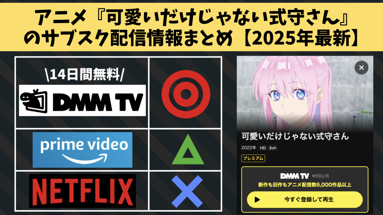 調査の結果、2025年現在でアニメ『可愛いだけじゃない式守さん』を無料視聴できるサブスクは、「DMM TV」「U-NEXT」「dアニメストア」となります。