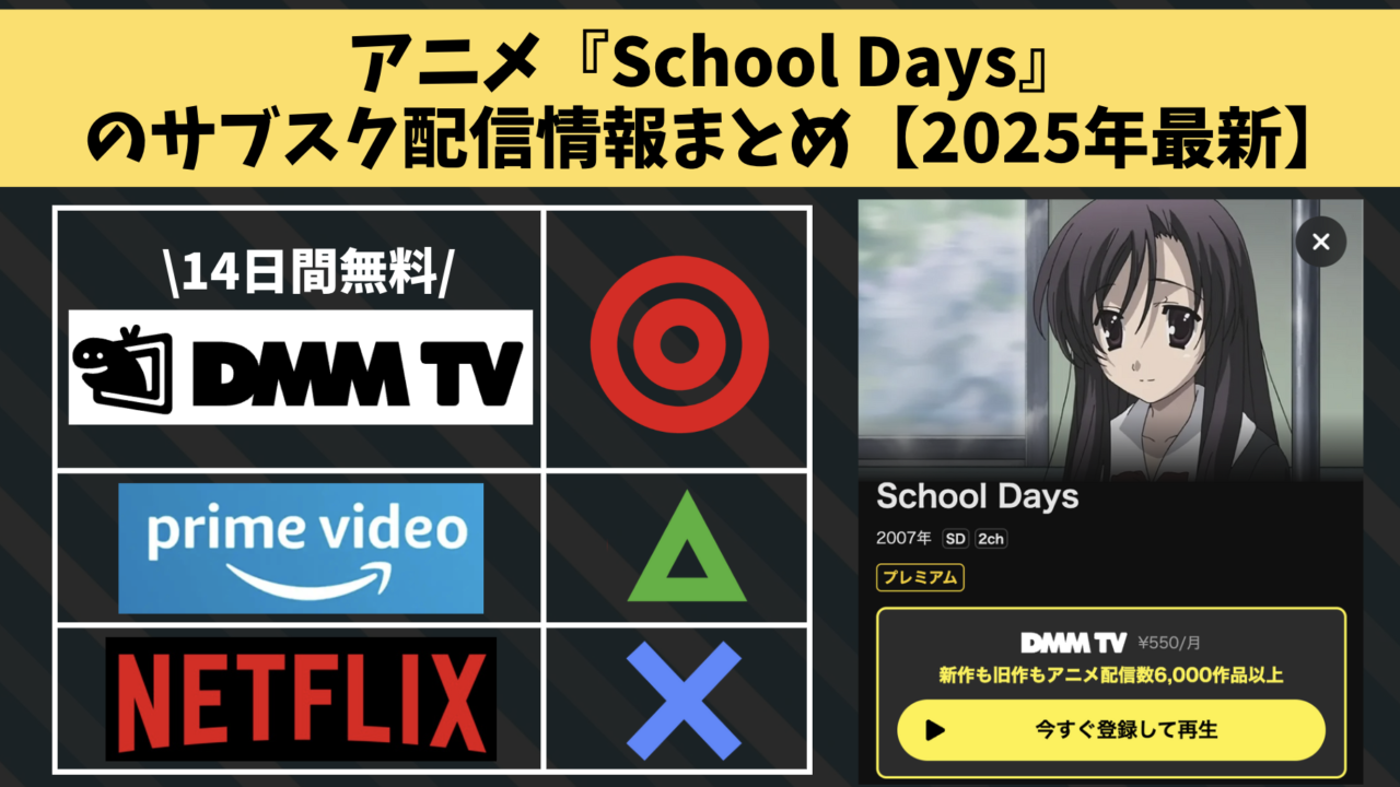 結論としまして、2025年現在でアニメ『School Days』を無料視聴できるサブスクは、「DMM TV」「U-NEXT」「dアニメストア」となります。