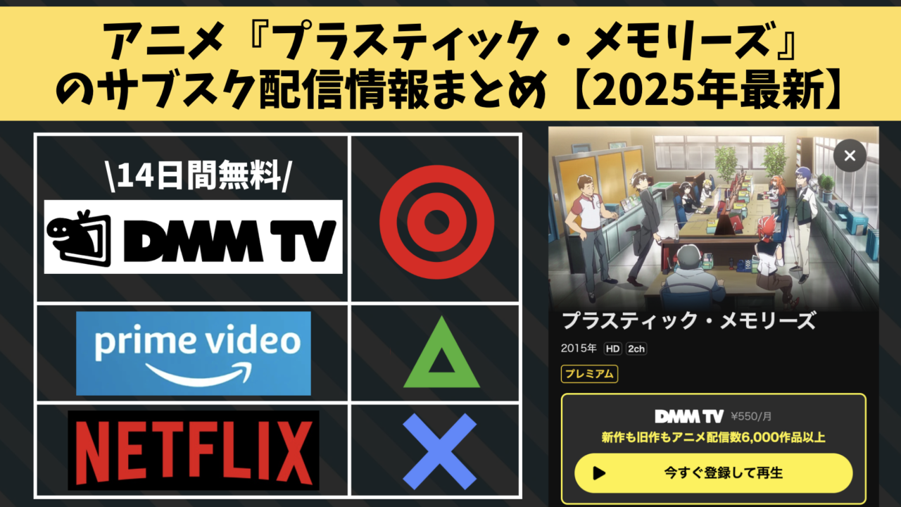 アニメ『プラスティック・メモリーズ』の大手サブスクサービスでの配信状況を調査し、「どこで見れるのか」一覧にまとめました。