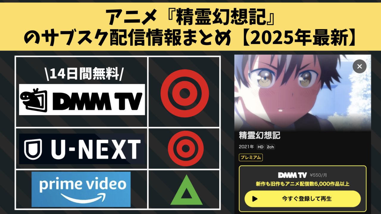 アニメ『精霊幻想記』の大手サブスクサービスでの配信状況を調査し、「どこで見れるのか」一覧にまとめました。